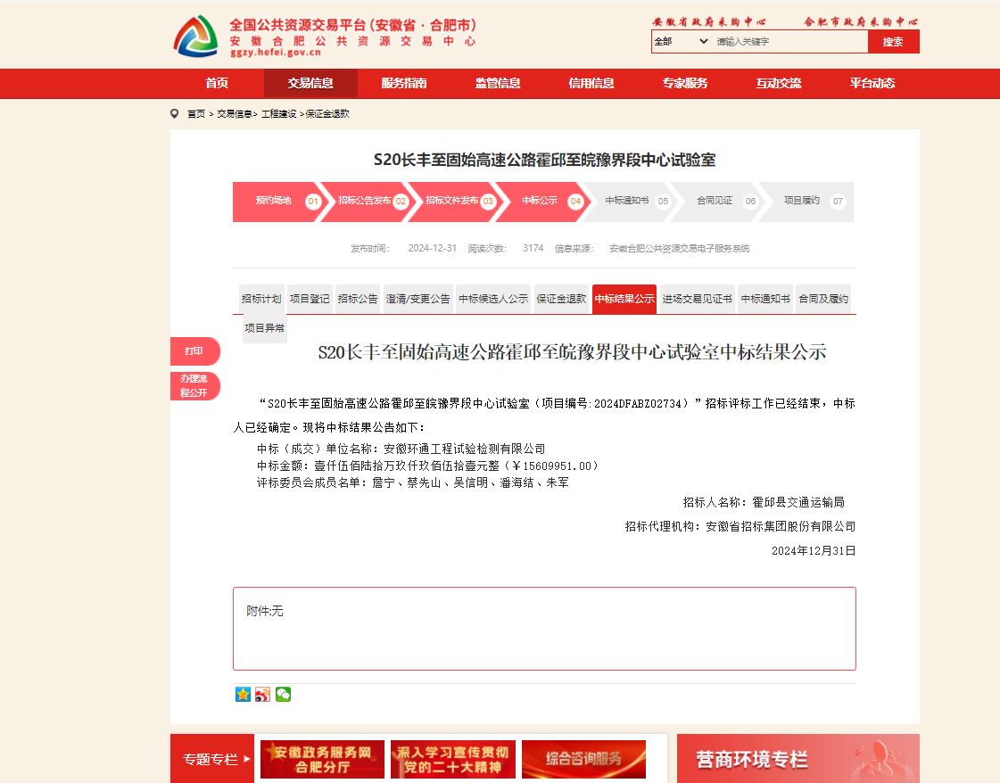 2024年12月31日,建工檢測(cè)所屬環(huán)通公司成功中標(biāo)S20長(zhǎng)豐至固始高速公路霍邱至皖豫界段中心試驗(yàn)室項(xiàng)目,中標(biāo)金額1560.9951萬元。