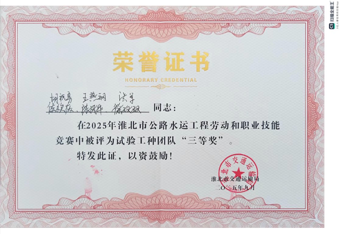此次獲獎,既是對公司技能人才培養成果的肯定,更激勵著全體員工以賽促學、以學促干,為淮北市公路水運工程高質量發展貢獻更多力量。